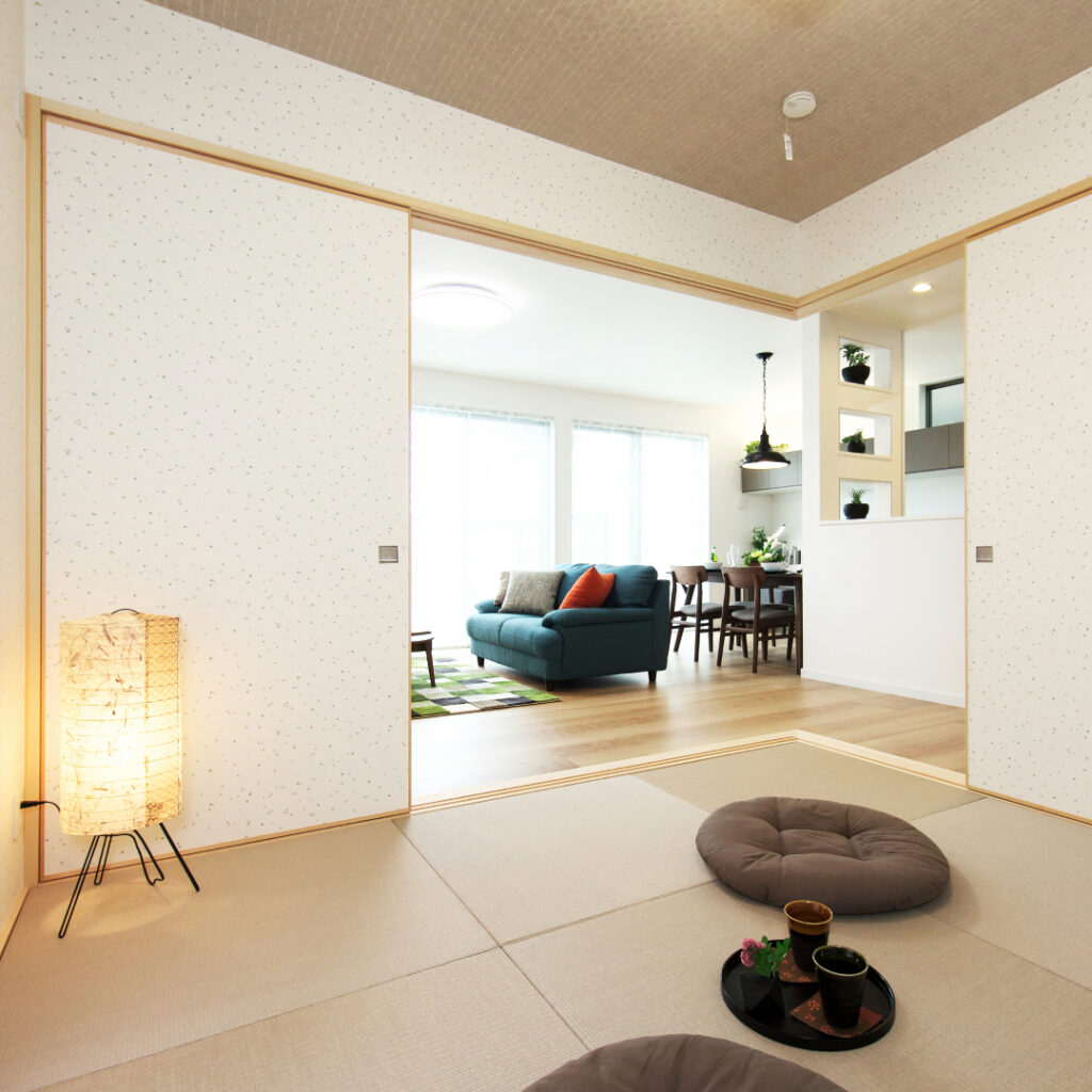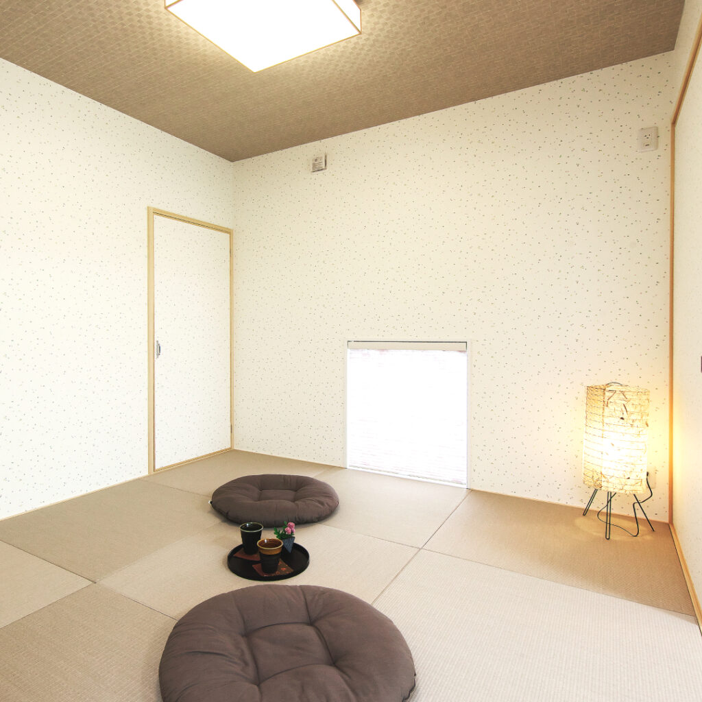 正方形の琉球畳にすることで、家族の暮らしに溶け込む現代的な和室に。
