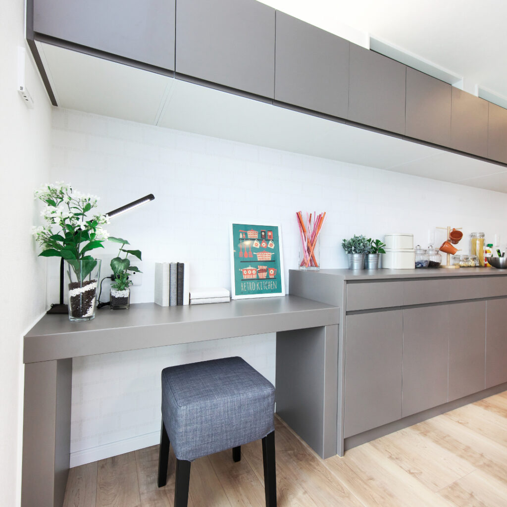 次の写真は、キッチン背面の壁際、収納棚に続くスペースに設けられた